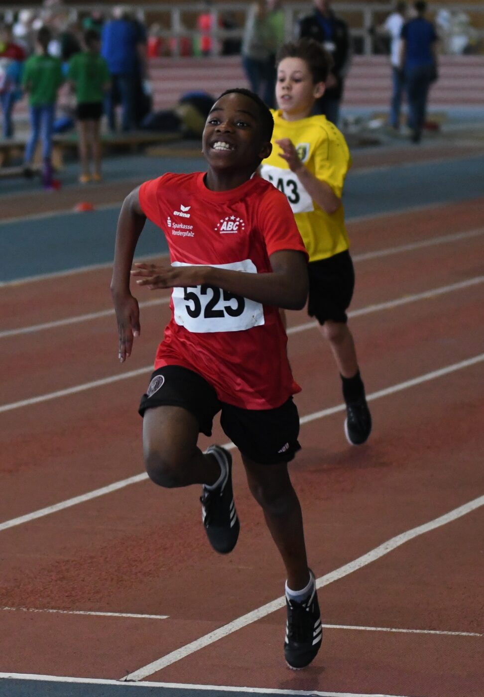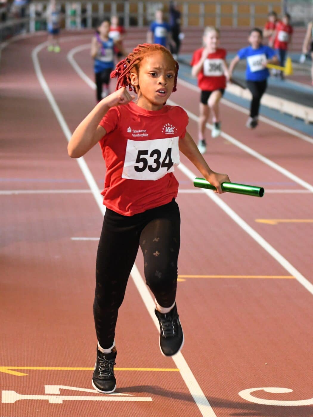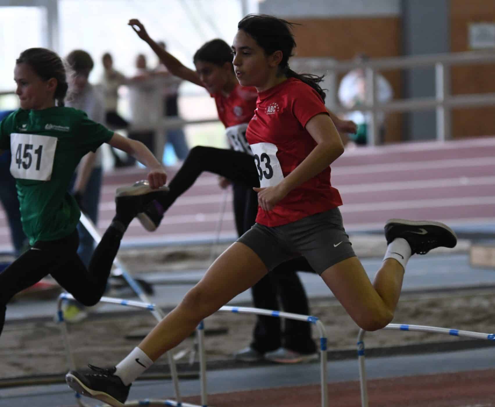 Ganz stark zeigte sich auch der Jahrgang U12 (W10). Hier gab es gleich drei Landestitel. Ella Christmann gewann Gold über 50m in sehr starken 8,17s, eine Bronzemedaille gab es in diesem Rennen für Prudence Ubadi in 8,21s, auf Platz 6 und 7 folgten Aminata Ndao in 8,35s und knapp dahinter Emylia Mbatchou Nguiaga in 8,37s. Ella gewann dazu den Weitsprung mit 3,85m und Aminata die Bronzemedaille mit 3,68m. Einen weiteren Titel holte sich Prudence über 50m Hürden in 9,73s, gefolgt von Aminata auf Platz drei in 9,95s. Zum ersten Mal ging Lorena Büchler über 800m ins Rennen. Taktisch klug setzte sie am Ende des Rennens einen Sprint an und holte sich damit die Bronzemedaille in 3:07,36min.