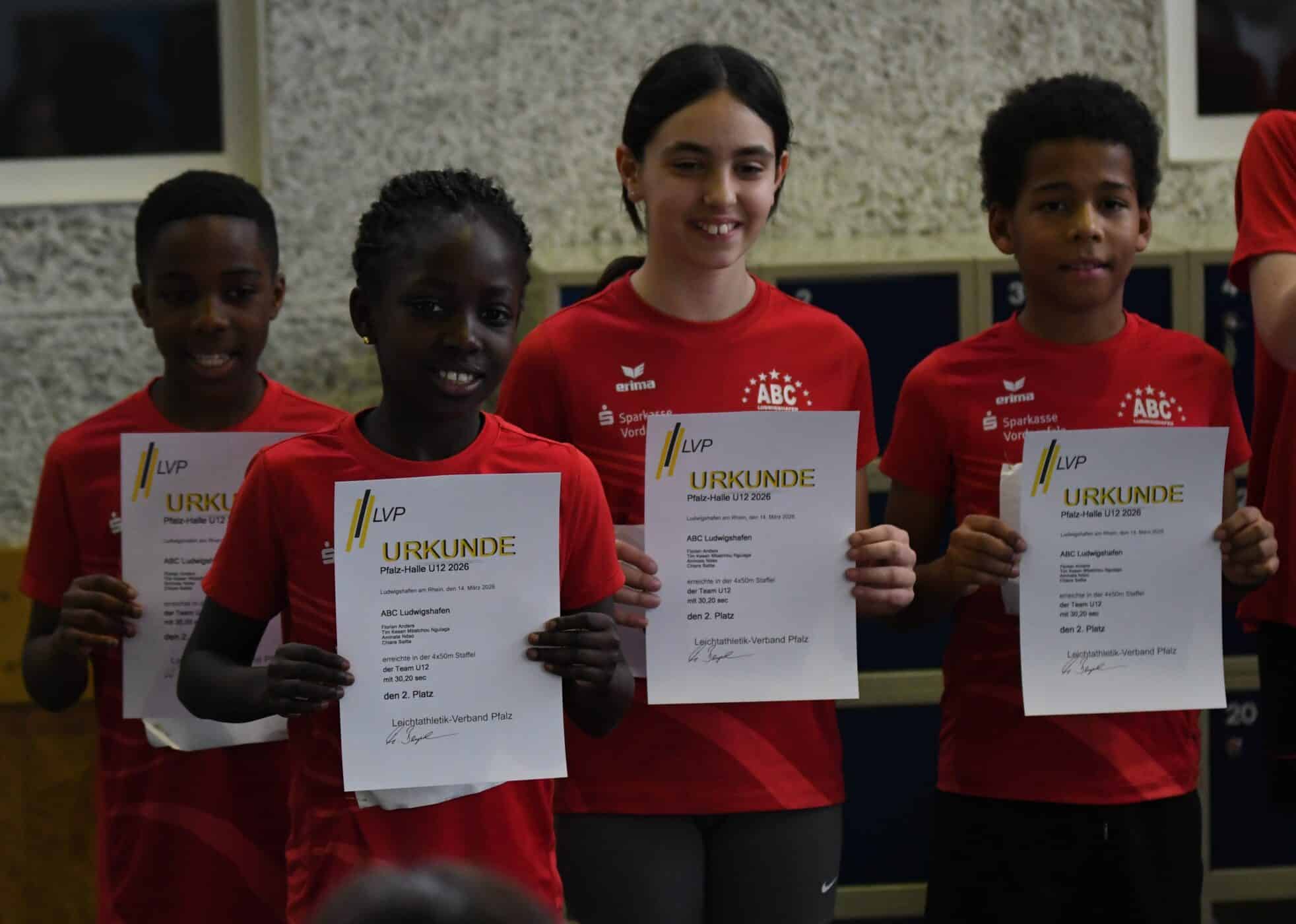 Einen weiteren Pfalzmeistertitel gab es in der U14 (W12). Hier gewann Alina Kastrati mit großem Vorsprung den Titel im Kugelstoßen mit 7,13m. Fast genauso erfolgreich war Louisa Behrens. Sie errang knapp hinter der Siegerin über 60m Hürden in 11,19s die Silbermedaille, Sophia Lupu folgte in diesem Rennen mit 12,35s auf Platz sechs. Letzteren Platz errang Elikia Kengi Gwang im Weitsprung mit 4,21m, einen Platz besser war Louisa mit 4,23m. Einen weiteren Endkampfplatz unter mehr als 60 Teilnehmerinnen erreichte Vicoria Nsimba auf Platz acht in guten 9,13s über 60m. Diesen Platz verpasste knapp Mila Krautschneider über 800m in sehr guten 2:58,13min.